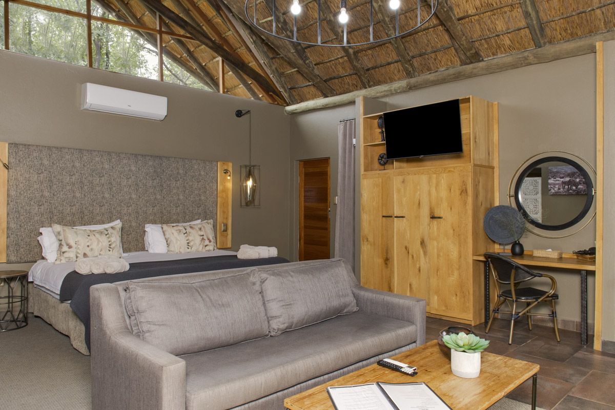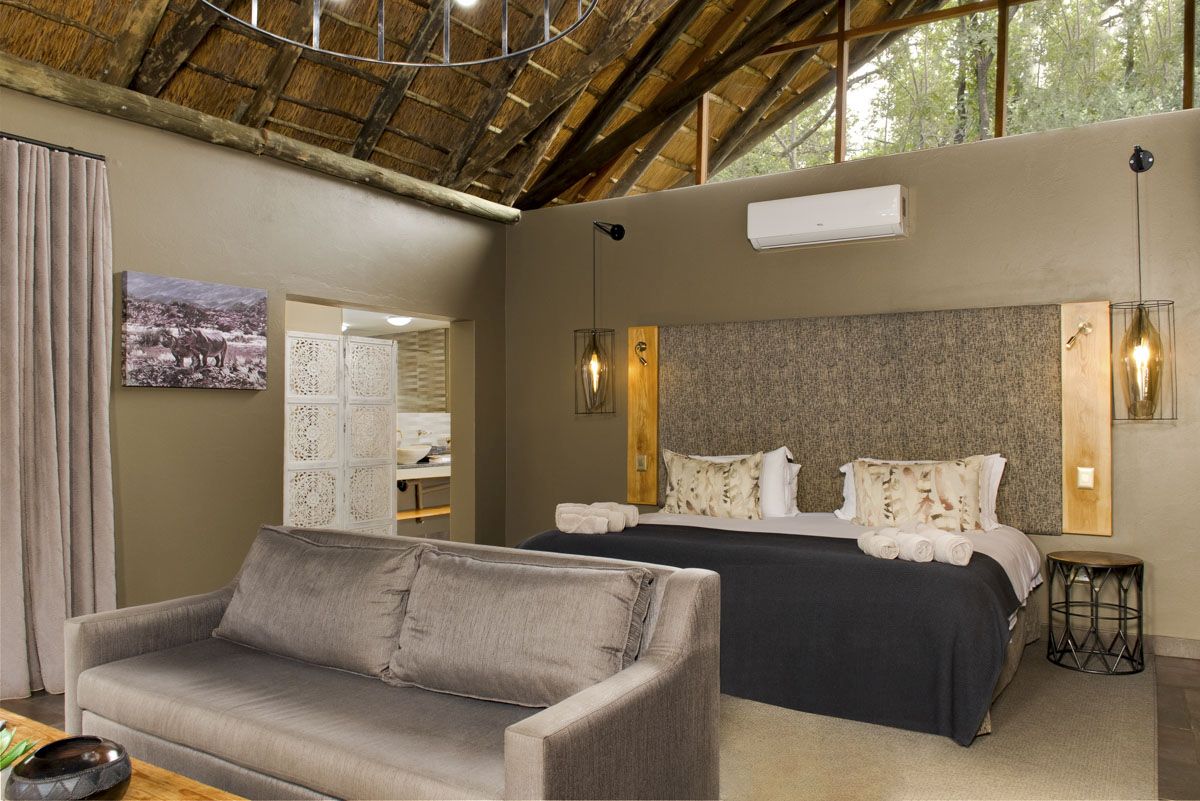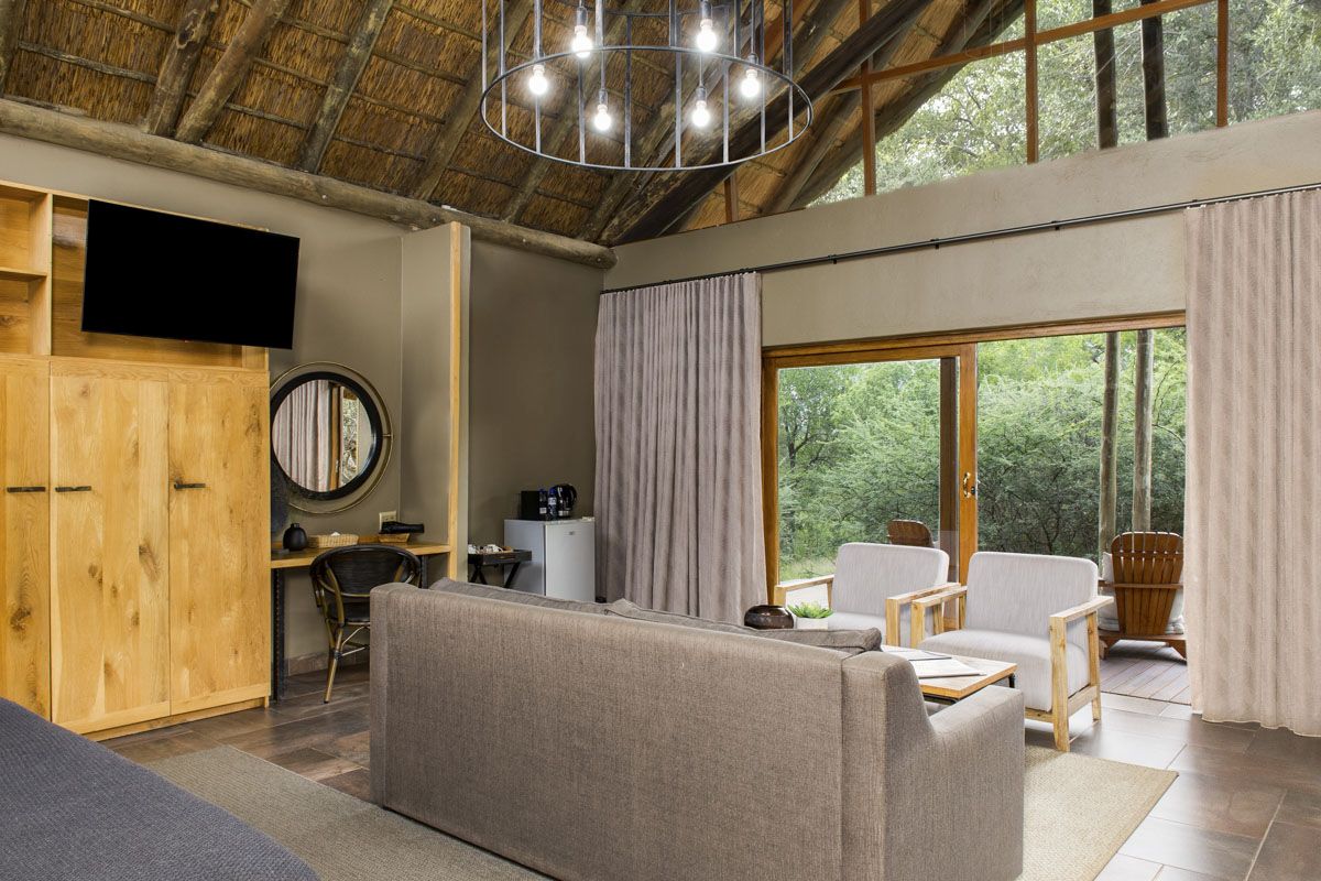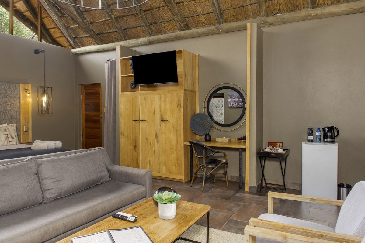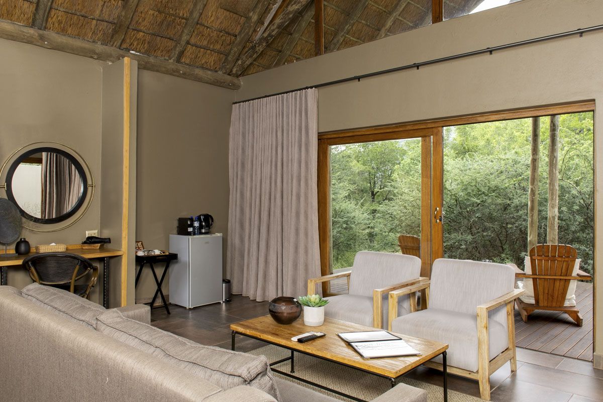 Each of our 19 Suites are generously spacious, featuring a large bedroom and a comfortable living area that opens onto a private veranda overlooking the African bushveld. Designed to blend seamlessly with the natural surroundings, the suites are elegantly furnished and thoughtfully equipped with modern comforts. Guests can enjoy tea and coffee-making facilities, a minibar, and a Smart TV loaded with Netflix, Showmax, and YouTube for relaxed in-room entertainment. Each suite also includes an en-suite bathroom with both an indoor and outdoor shower, a bath tub, and air-conditioning to ensure comfort throughout the seasons.